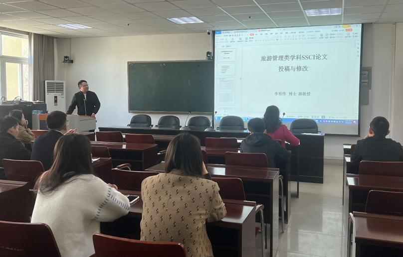 3月13日上午, 四虎影院 第七期“景明论坛”在经管楼401会议室成功举办。 四虎影院 李明伟博士作了题为“旅游管理类学科SSCI论文投稿与修改”的学术报告, 四虎影院 部分师生聆听了报告。