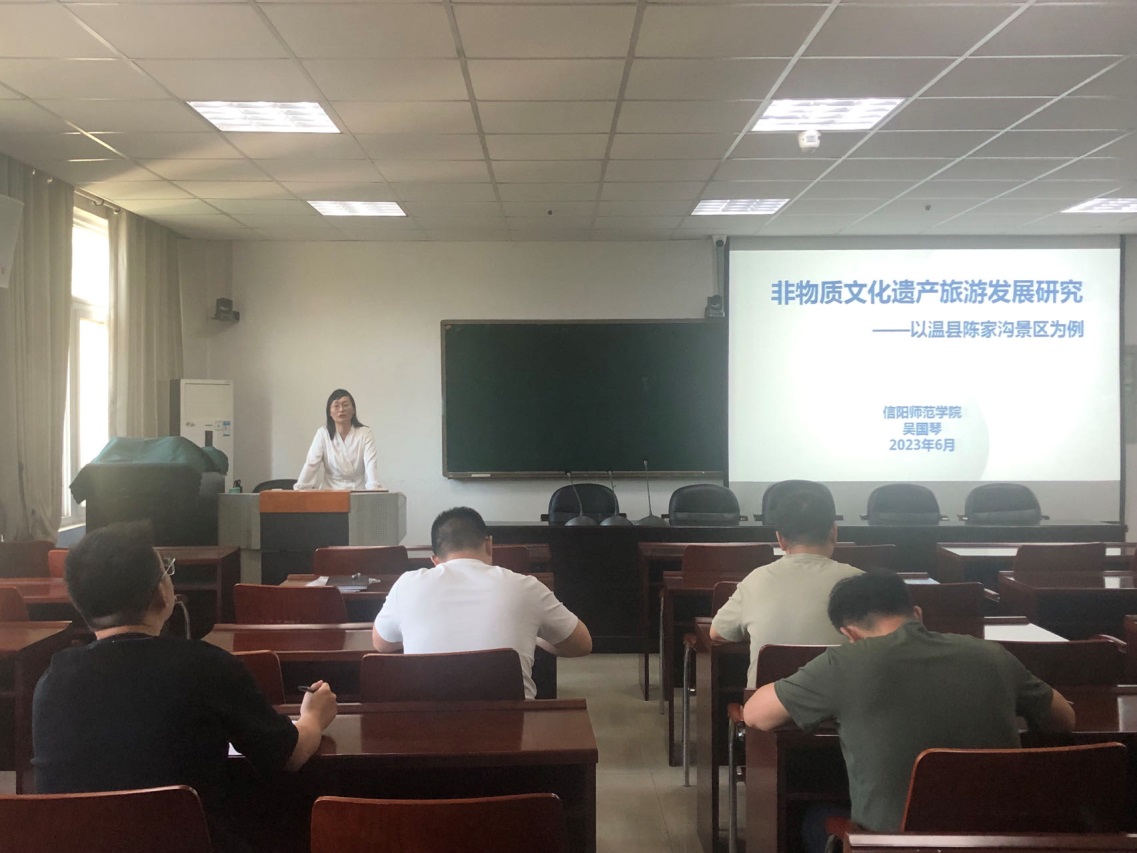 报告围绕非物质文化遗产的概念、非物质文化遗产旅游开发模式、非物质文化遗产旅游的十个案例、陈家沟景区非物质文化遗产的旅游开发与保护实践、黄河非遗点亮老家河南等方面展开。报告结束后,吴教授与在座师生展开了深入交流。