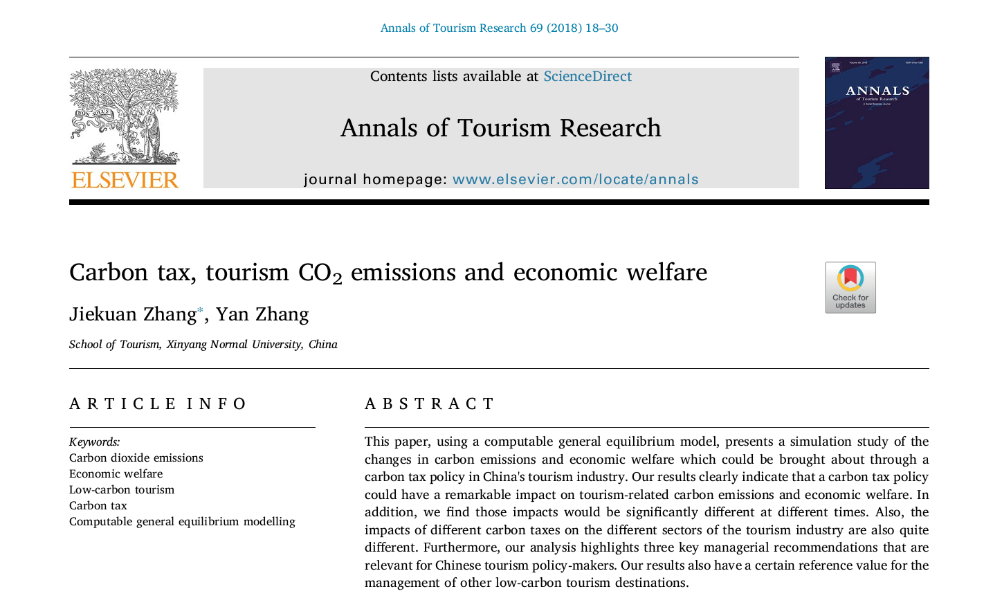 近日,国际旅游学科顶级权威期刊《Annals of Tourism Research》刊登了四虎影院 章杰宽博士的研究论文《Carbon tax, tourism CO2emissions and economic welfare》(Volume 69, 2018, Pages 18–30)。《Annals of Tourism Research》是国际公认的最顶尖的旅游学术期刊,代表着国际旅游学术研究的最高水平,在国际旅游研究领域享有崇高的声誉。在中科院SSCI分区中,该刊属于管理学大类的一区期刊。