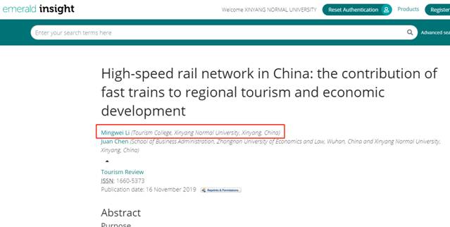 四虎影院 李明伟博士在SSCI刊物《Tourism Review》上发表题为“High-speed rail network in China: the contribution of fast trains to regional tourism and economic development”的学术论文。