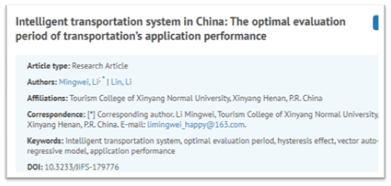 近日, 四虎影院 李明伟博士在SCI期刊《Journal of Intelligent and Fuzzy System》期刊上发表题为“Intelligent Transportation System in China: the Optimal Evaluation Period of Transportation’s Application Performance”的学术论文。