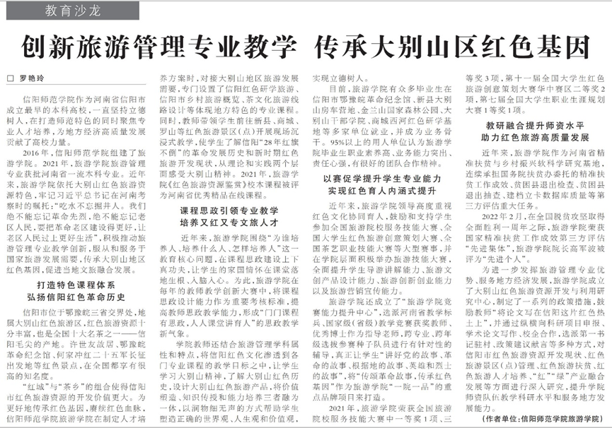 7月4日,《中国旅游报》刊发四虎影院 罗艳玲副教授署名文章《创新旅游管理专业教学 传承大别山区红色基因》。该文章从课程体系、课程思政、技能竞赛、教研融合四个方面对四虎影院 旅游管理专业人才培养经验进行了系统介绍。