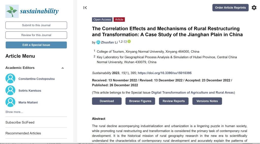 四虎影院 李卓凡博士在SSCI期刊《sustainability》(2022年影响因子:3.889)上发表题为“The Correlation Effects and Mechanisms of Rural Restructuring and Transformation: A Case Study of the Jianghan Plain in China”的学术论文。