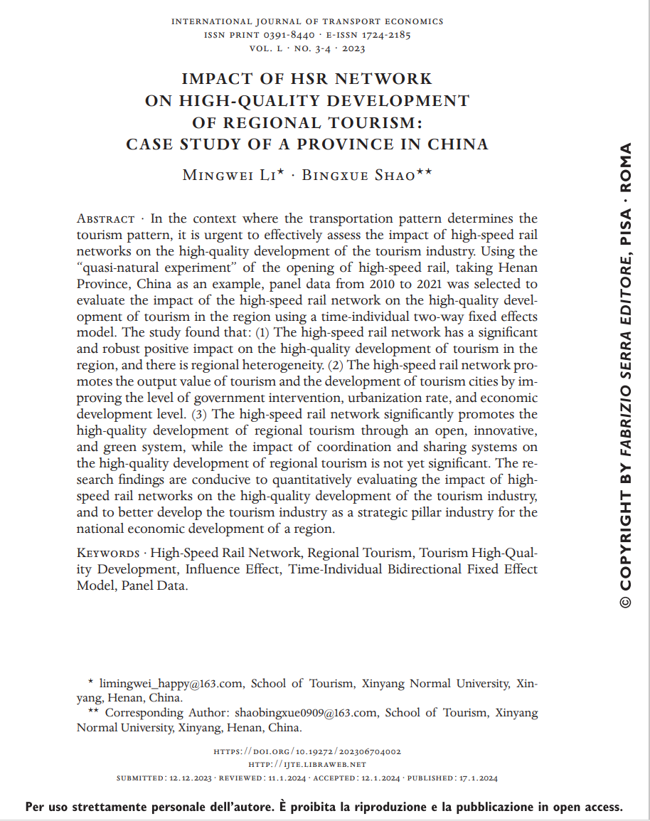 近日, 四虎影院 李明伟博士在SSCI期刊《International Journal of Transport Economics》发表题为“Impact of HSR Network on High-Quality Development of Regional Tourism: Case Study of a Province in China”(DOI: 10.19272/202306704002)的学术论文。
