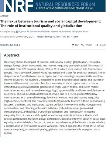 近日, 四虎影院 宋春巧博士为第一作者在SSCI期刊《Natural Resources Forum》发表题为“The nexus between tourism and social capital development: The role of institutional quality and globalization”的学术论文。宋春巧博士毕业于澳门城市大学城市规划与设计专业,现为 四虎影院 讲师,研究方向为旅游规划和非物质遗产保护。