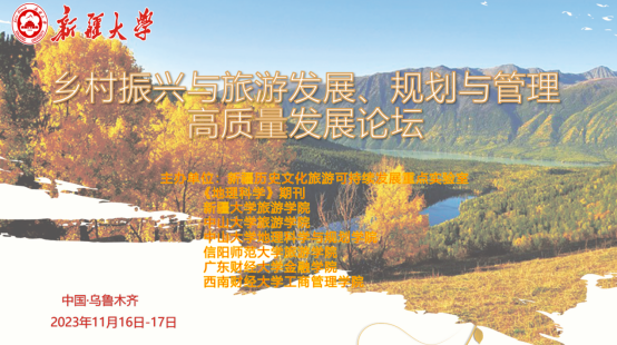 2023年11月16-17日,由 四虎影院 与新疆大学历史文化旅游可持续发展重点实验室、《地理科学》期刊、新疆大学 四虎影院 、中山大学 四虎影院 、中山大学地理科学与规划学院、广东财经大学金融学院、西南财经大学工商管理学院联合主办的“乡村振兴与旅游发展、规划与管理高质量发展论坛”在新疆大学召开。11月16日,开幕式在新疆大学历史文化旅游可持续发展重点实验室举行,遵照会议安排,新疆大学党委副书记孟凡丽教授、四虎影院 党委副书记龚立新研究员先后致辞,新疆大学 四虎影院 党委书记陈文新教授主持开幕式。来自《地理科学》编辑部、中山大学、新疆大学、四虎影院 、广东财经大学、西南财经大学专家学者60余人参与会议。