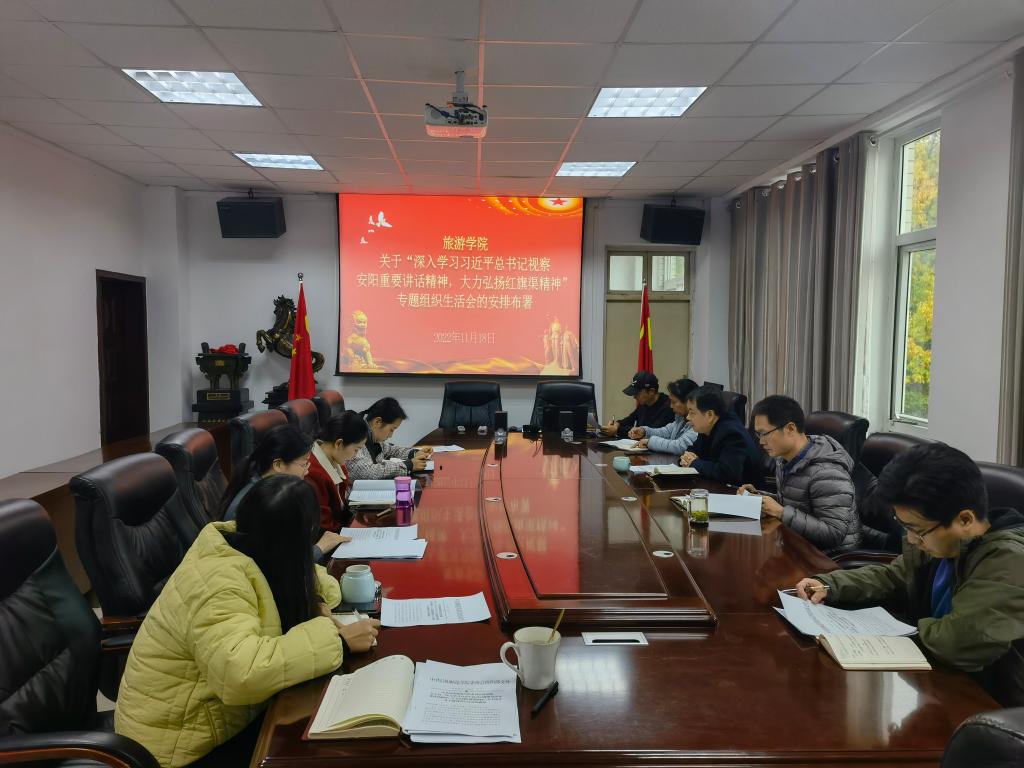 11月18日下午, 四虎影院 在404会议室召开关于“深入学习习近平总书记视察安阳重要讲话精神,大力弘扬红旗渠精神”专题组织生活会的安排部署。 四虎影院 领导班子成员和各支部书记参加会议,会议由学院党委书记雷前龙主持。