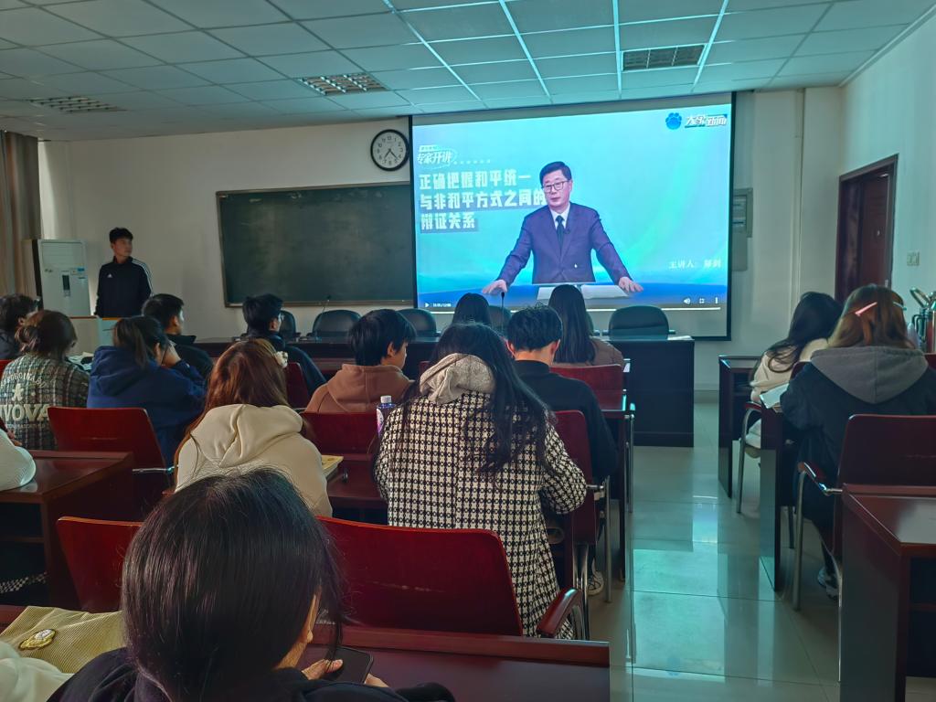 为推动涉台教育机关活动进一步深化,提高学生对中央对台方针政策的认识,11月17日下午15时, 四虎影院 专职组织员王亚文组织部分学生在经管楼401室收看了全国台湾研究会理事郑剑教授的正确把握和平统一和非和平方式的辩证关系专题讲座。