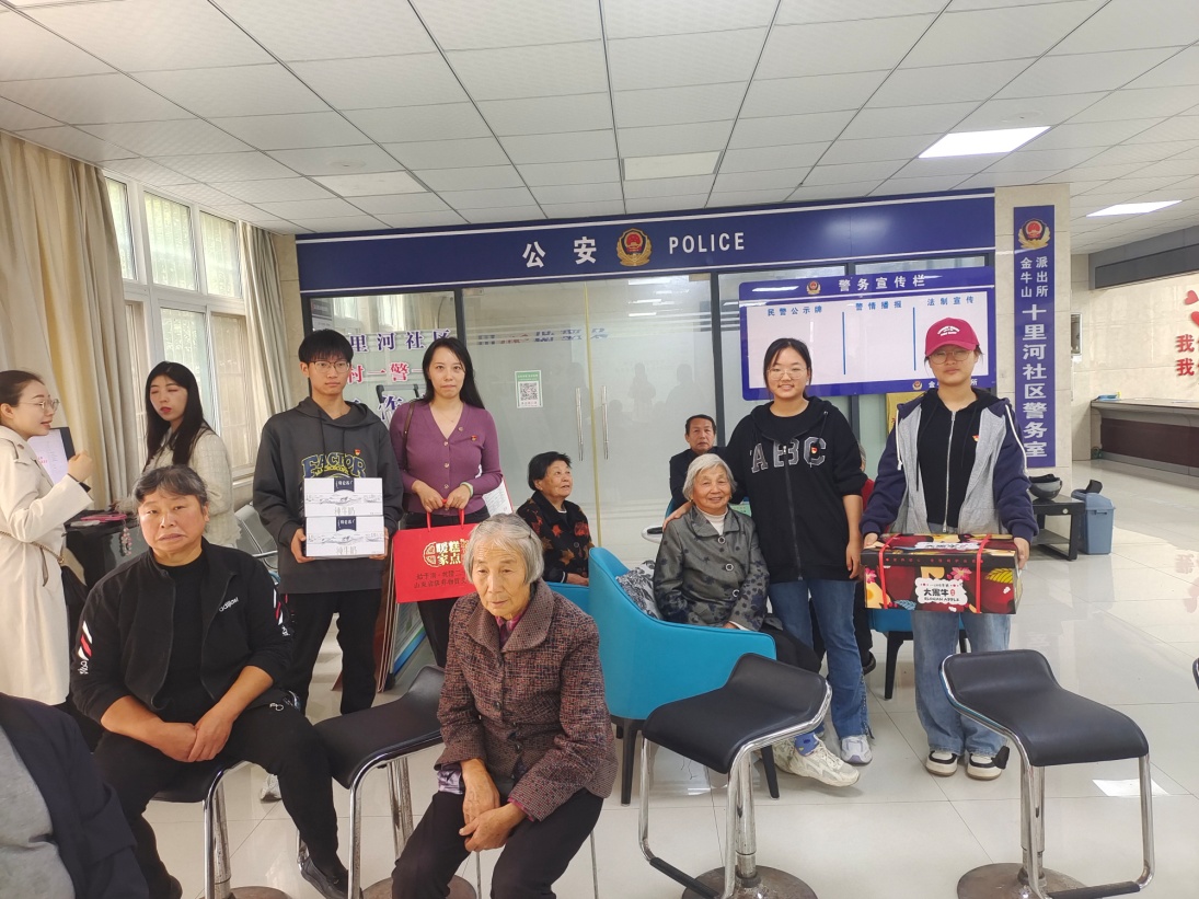 党支部党员怀着真挚之心,带着牛奶、苹果、月饼等慰问品来到十里河社区,用实际行动为老人们送去关爱和温暖,帮助老人树立紧跟党走、乐观向上的思想,切实提升老人们的获得感、幸福感和归属感。闫会姝老师与老人们共话中秋,欢度国庆,表达了对老人们的亲切关怀和祝福。党员李亚倩详细询问老人的家庭情况与身体状况,了解老人的饮食安排和生活所需,叮嘱老人要多注意饮食,保持良好的作息习惯,有问题及时向组织反映。