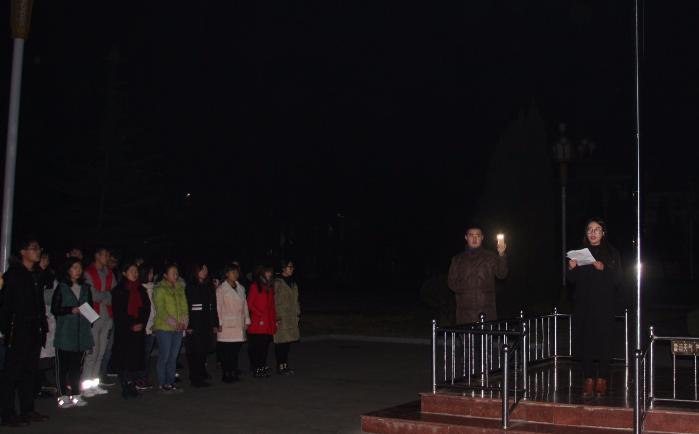 12月12日早, 四虎影院 在行政楼前明德广场举行首次升旗仪式。四虎影院 党委副书记张晓峰,团委老师张庆敏出席升旗仪式,与全体16级学子共同见证这一庄重时刻。