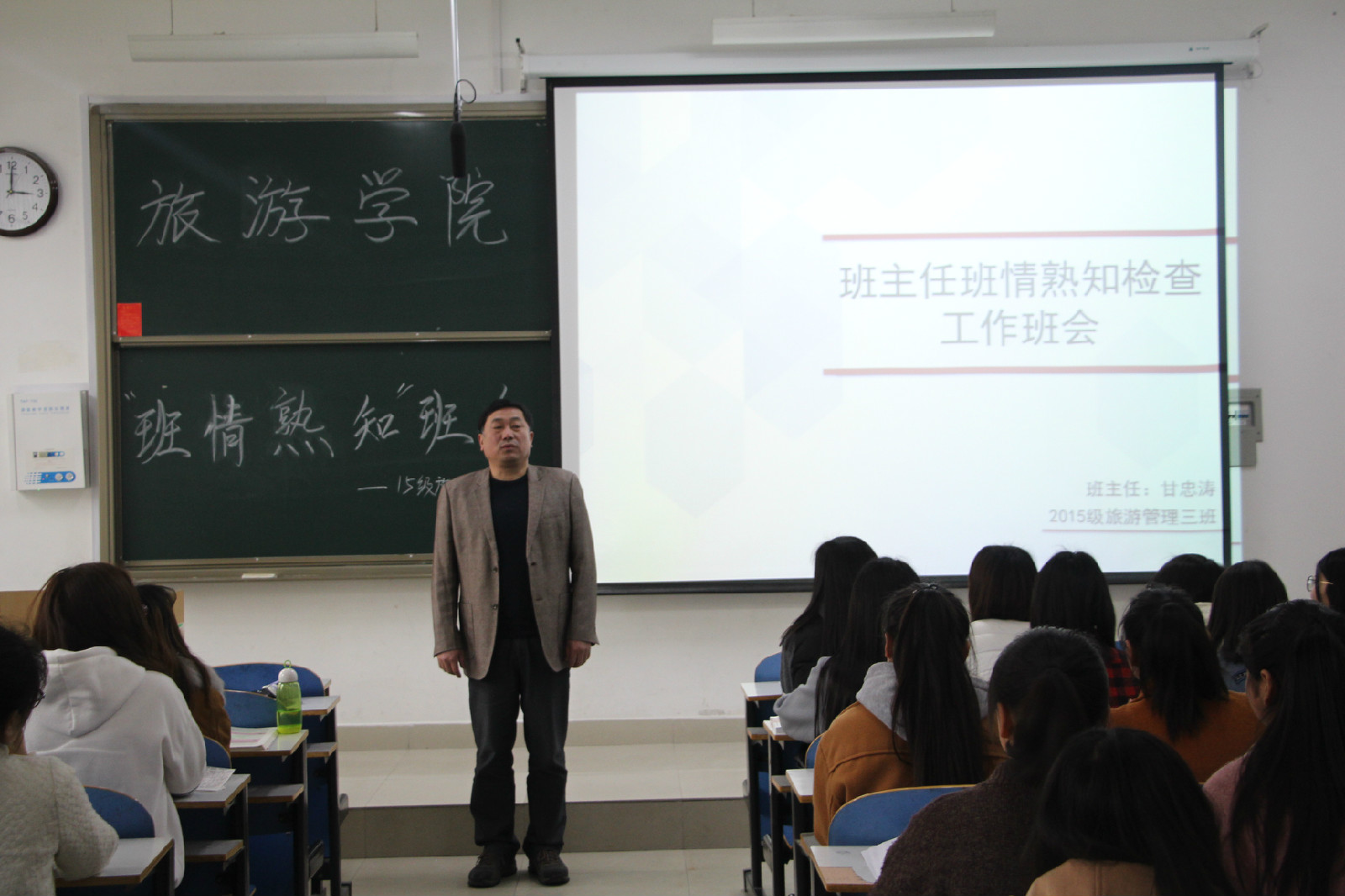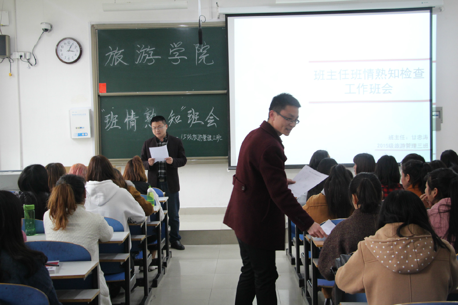 为响应学生处下发的《关于开展辅导员(班主任)班情熟知检查工作的通知》,3月17日下午, 四虎影院 2015级旅游管理三班班情熟知检查工作主题班会在经管楼202教室顺利召开。学生处副处长严彬,管理科科长黄树余及四虎影院 党委书记曹明贵,副书记张晓峰携全体辅导员参加班会。