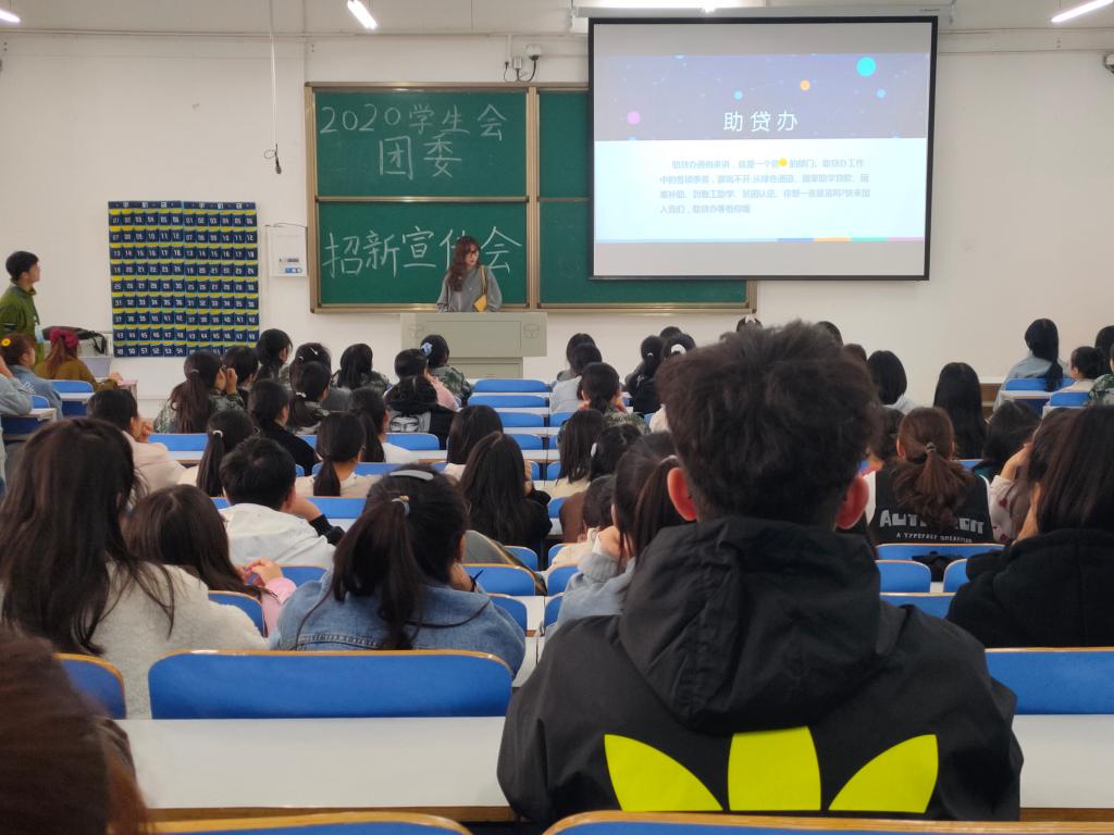 10月17日, 四虎影院 团委学生会招新大会于社科楼215如期举行,团委、学生会各部门以及2020级全体新生参加大会,会议由学生会主席王非凡主持。