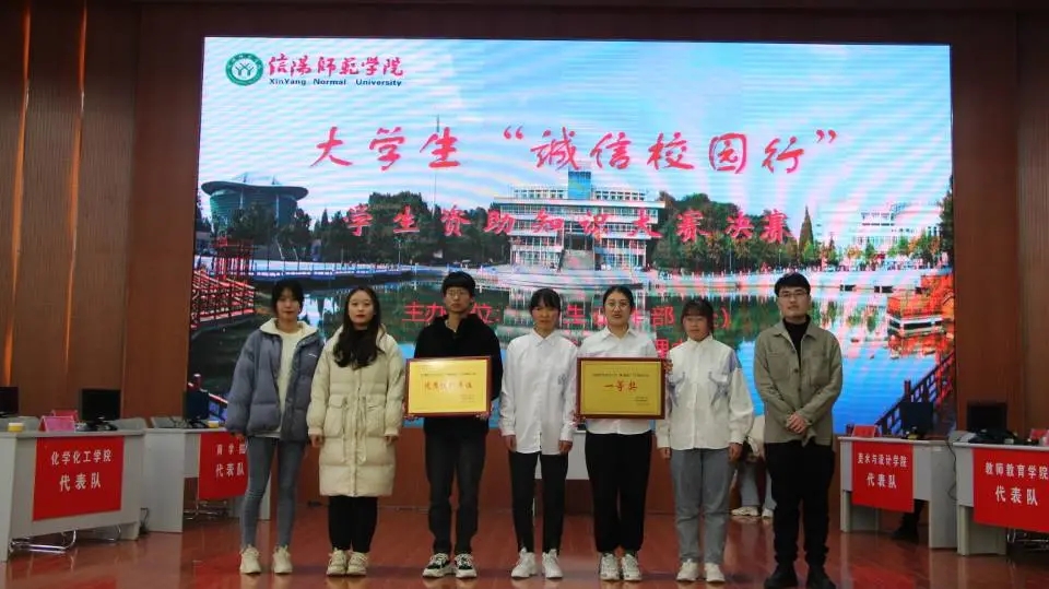 为积极宣传党和国家的学生资助政策,充分展示广大学生在国家资助政策帮助下自立自强、拼搏向上的青春风采,营造出形式多样、健康向上、格调高雅的诚信校园文化氛围。12月14日,信阳师范学院于逸夫楼报告厅举行大学生"诚信校园行"学生资助知识大赛决赛。信阳师范学院学生工作部处长王建旭、以及各学院党委副书记、辅导员级学生代表亲临现场观看比赛。