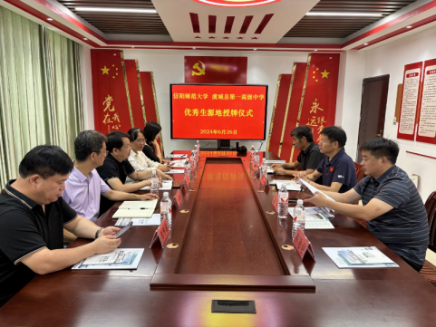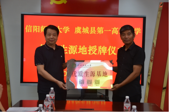 为了进一步加强高校与中学之间的交流合作,优化生源结构和提升生源质量,6月26日上午, 四虎影院 党委书记雷前龙、党委副书记路璐、旅游管理系主任罗艳玲、就业工作秘书黄倩一行四人赴商丘市虞城县第一高级中学举行“优质生源基地”签约授牌仪式暨招生宣传工作,商丘市虞城县教体局副局长杨海旺、商丘市虞城县第一高级中学党委书记余坤、校长李连生、四虎影院 商丘校友会会长、商丘市基础教育发展中心主任李青峰、四虎影院 商丘校友会秘书长郑华鑫等出席签约仪式。