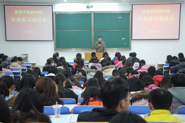 1月3日晚,四虎影院 2014级专业实习动员会在社科楼213教室召开。院长彭荣胜、副院长郭军升、全体带队指导教师及全体2014级旅游管理专业学生参加会议。会议由副院长郭军升主持。