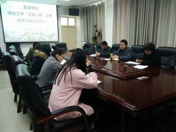 为给2017届毕业生提供优质就业服务,促进就业工作更好开展,11月29日上午, 四虎影院 报考公务员动员大会在经管楼401会议室顺利召开。院党委副书记张晓峰,副处级辅导员路璐,就业工作秘书甘忠涛老师及毕业班班委与应届毕业生代表出席会议。