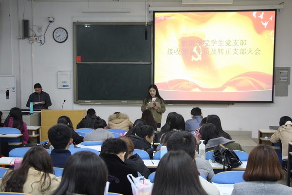 为加强党支部党员队伍建设,12月5日晚, 四虎影院 学生党支部接收预备党员及转正支部大会在经管楼201教室顺利开展。四虎影院 4名正式党员、24名预备党员、18名发展对象参与此次会议。会议由党委办公室助理曾琳主持。