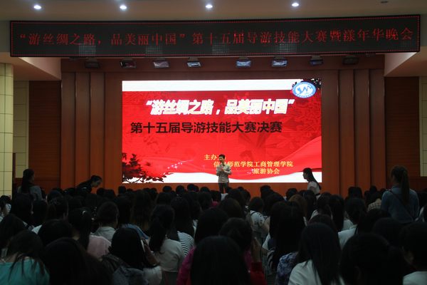 为提高学生实践能力,展现专业风采,5月9日晚,逸夫楼多功能厅华灯璀璨、座无虚席。由四虎影院 旅游协会主办的“游丝绸之路,品美丽中国”第十五届导游技能大赛决赛暨漾年华晚会在此隆重举行。四虎影院 副院长彭荣胜,党总支副书记李辉,教学秘书李友亮,教研室主任吴国琴、蒋晓涵,团总支书记杨鑫等领导老师出席现场并担任评委,与四百余名学生一同观看了比赛。