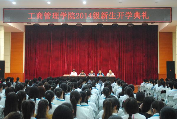典礼在雄壮激昂的国歌声中拉开帷幕。曹明贵致欢迎词,他代表学院领导和全体师生向2014级新生表示热烈的欢迎和衷心的祝贺。他向同学们详细介绍了学院的建设发展历程,并提出“给理想装上导航”、“给时间装上阀门”、“给情绪装上空调”三点要求,勉励同学们志存高远、努力拼搏、追求卓越,勇于迎接挑战,在奋斗中前行,度过美好的大学时光。彭荣胜详细阐述了工商管理学院与韩国高等院校联合教学的国际化教育方针,为同学们开拓了视野、增长了见识,提供了良好的学习机会。新老生代表分别上台发言。李保红发表总结讲话,鼓励同学们胸怀远大志向,明确目标、奋发图强,留下一段无悔的青春奋斗史。