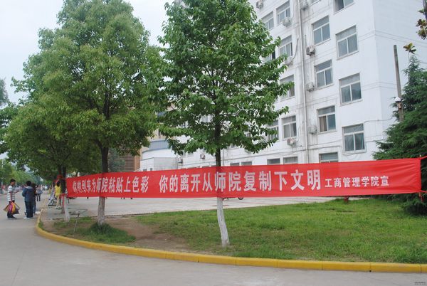 为保证毕业生文明离校,引领校园文明之风,同时响应国家的号召,投笔从戎,报效祖国,工商管理学院在校园内悬挂“你的到来为师院粘贴上色彩你的离开为师院复制下文明”、“学的千经万典,方知文明为先;留下美好背影,带走信阳风范”等条幅,通过形象生动的话语引导毕业生充分发挥好好模范带头作用,爱护校园的花草树木,保护公共财产,提高自身素质,争做文明使者,在步入社会后,继续发扬师院风范,成为德才兼备的社会型人才,并希望毕业生将自己的文明精神传达给低年级同学,复制下文明,使文明的种子届届相传。