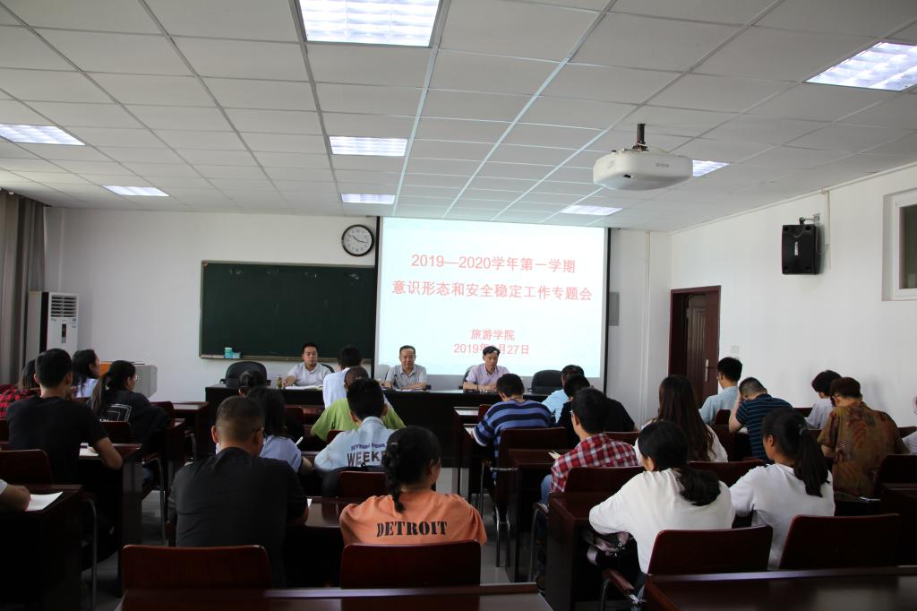 9月27日上午, 四虎影院 在经管楼401会议室召开意识形态和安全稳定专题工作会议。党委书记曹明贵、院长彭荣胜、党委副书记张晓峰出席会议。副处级辅导员路璐、团委书记张庆敏、思想政治教育与就业指导教研室主任甘忠涛、专职组织员闫会姝,班主任和主要学生干部记参加了会议。会议由张晓峰主持。