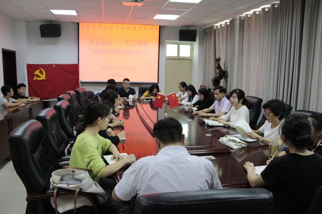 为庆祝中华人民共和国成立70周年,响应学院党委关于“不忘初心、牢记使命”主题教育的要求,进一步深化“我和我的祖国”主题教育活动,9月27日, 四虎影院 教工第一党支部和部分学生代表在经管楼403开展“我和我的祖国”主题党日活动。院长彭荣胜作为党委委员联系支部成员,以普通党员身份参加会议,会议由教工第一党支部书记谌静主持。
