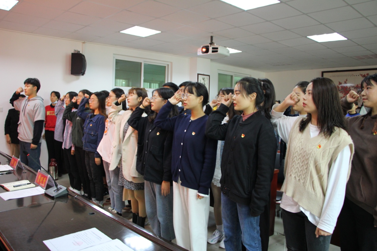 受疫情影响, 四虎影院 党委预备党员入党宣誓大会推迟至10月14日下午,在经管楼401举行。 四虎影院 党委书记曹明贵、副处级辅导员路璐、学生党支部书记郑征、专职组织员闫会姝和 四虎影院 全体学生党员及入党积极分子参加此次会议。会议由路璐主持。