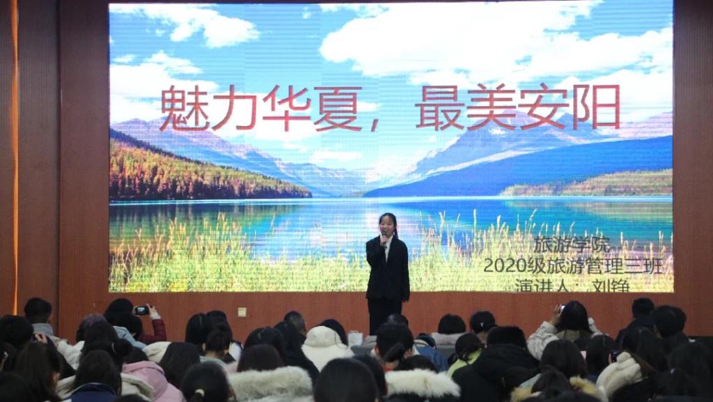 经过前期预赛,最终有六位选手脱颖而出进入决赛。决赛涵盖了旅游城市模拟讲解、旅游专业知识问答、个人才艺展示三个主要环节。比赛在精彩的开场舞后正式拉开帷幕。在比赛过程中,六名选手分别围绕六座特色迥异的城市和景区,制定了详细的旅游攻略,并通过精美的PPT逐一进行了情境模拟解说。其中一号选手杨擎擎声情并茂地向我们介绍了“比华山高险、与黄山竞秀”的桐柏山,还以诙谐幽默的语言展示桐柏山的特色小吃,将现场气氛推向高潮。在赛场上,选手们凭借优美的旅游景点、扎实的旅游知识和精湛的讲解技能,带领观众们身临其境般地游览了祖国的大好河山,领略了各地的人文风情,充分展现了自身精神风采,赛出了较高的专业水准。经过激烈角逐,最终孙松蒙荣获了一等奖,杨擎擎、刘铮荣获二等奖,董昱鑫、许佳佳、郑紫葳荣获三等奖。本次旅游知识竞赛在观众们的阵阵掌声中圆满落幕,赛后选手们和评委老师合影留念。