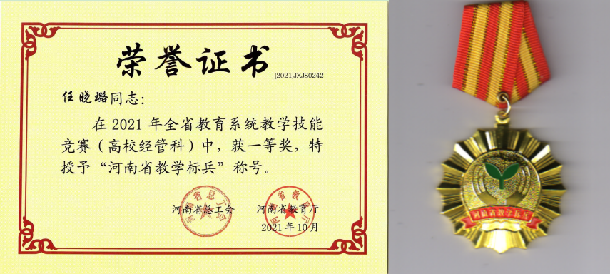 近期,四虎影院 教师在河南省教育厅、河南省总工会组织的2021年度全省教育系统教学技能竞赛中再获佳绩,任晓璐老师荣获高校经管科一等奖,同时被授予 “河南省教学标兵”称号并颁发奖章。