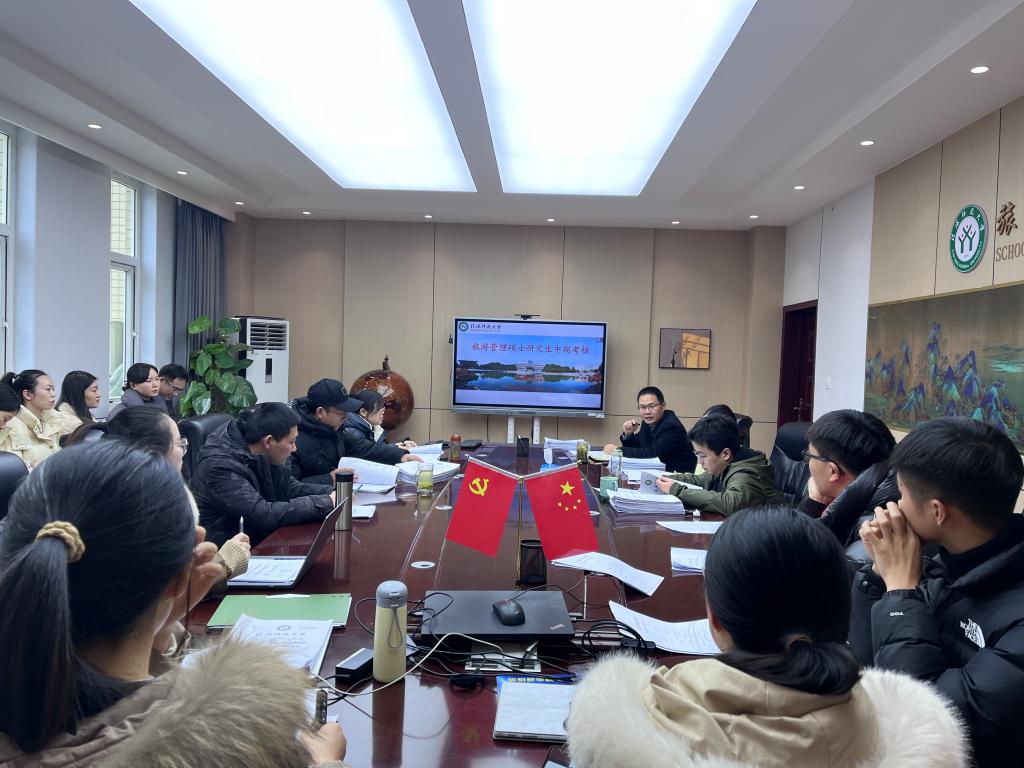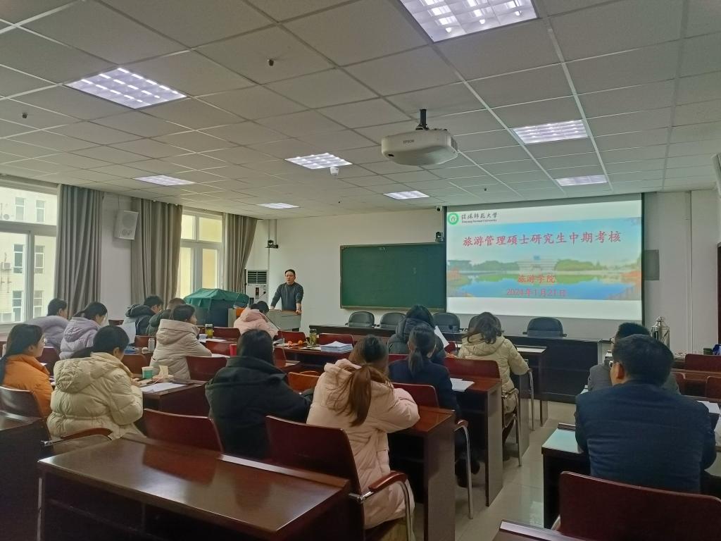 1月21日下午, 四虎影院 旅游管理硕士研究生中期考核分两组在经管楼401和404会议室同时进行。本次考核由高军波教授和李明伟副教授担任组长,考核评委由校内导师8人组成。